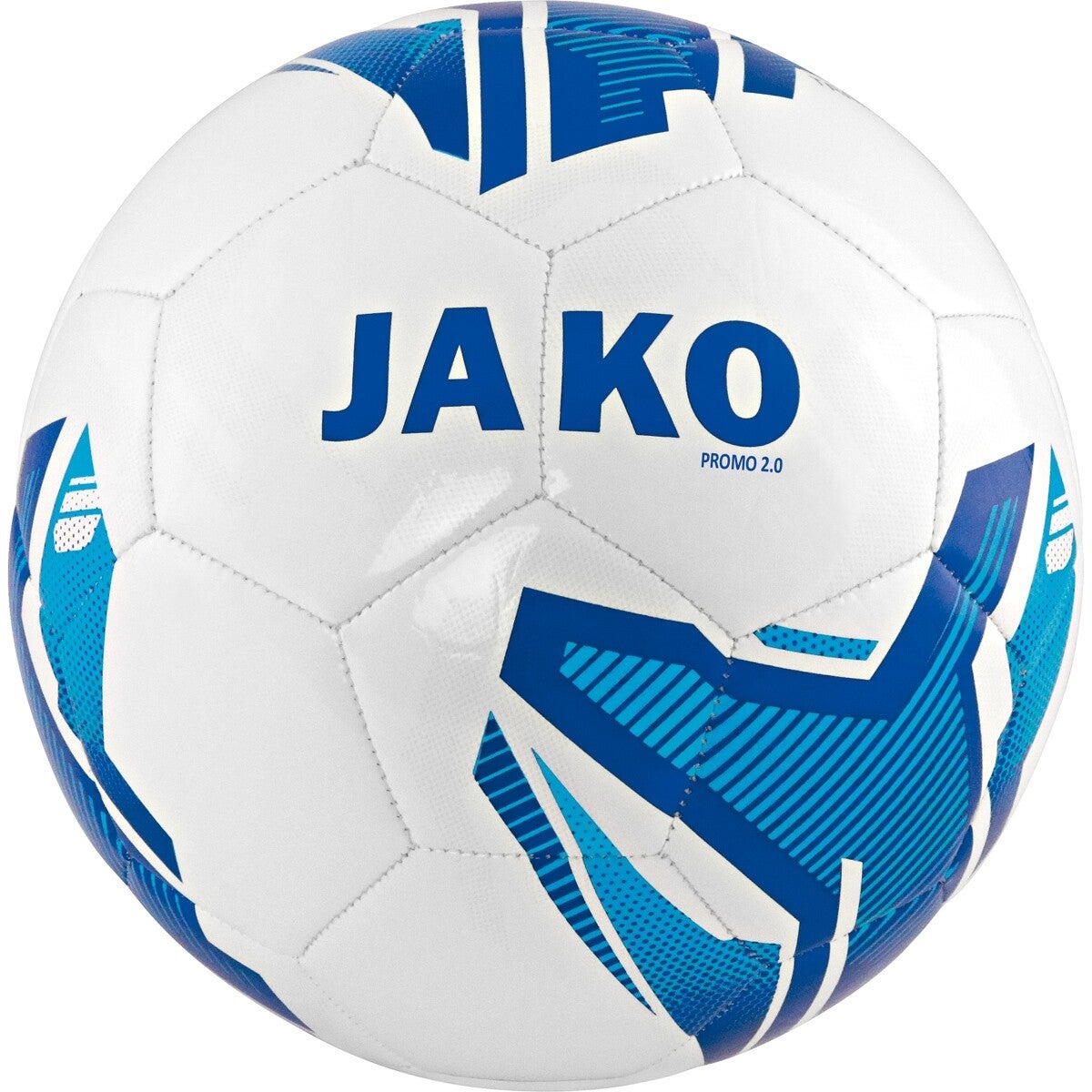 De PROMO 2.0-bal is uw ideale voetbalmaatje. Hij is machinegenaaid en bestaat uit 32 panels. Hierdoor is deze voetbal bijzonder stevig, bestand tegen heel wat vormen van belasting en duurzaam. Aan de binnenkant van de 32 panels bevindt zich een butylblaas die de lucht in de bal houdt en minimaal luchtverlies waarborgt. De bal Promo is beschikbaar in wit / JAKO blauw / navy in de maten 3, 4 en 5. Koop de Promo 2.0-bal in de JAKO-voetbalshop.