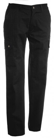 Klassieke all-season damesbroek met elastiek opzij en ceintuurlussen. Ritssluiting met metalen knoop, twee zakken voor, twee zakken met klep opzij met kliksluiting, een zak met rits links, een uitvouwbare zak voor rolmaat rechts, twee steekzakken achter met knoop en knoopsgat.